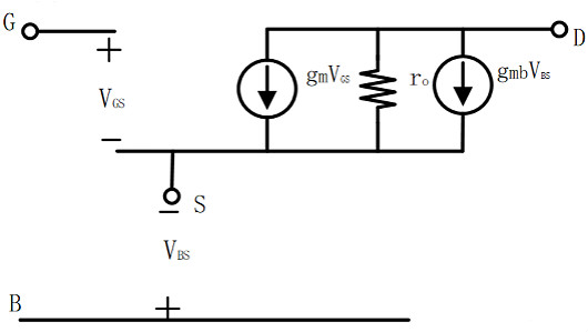 3. 考慮襯底偏置效應(yīng)(體效應(yīng)) 前面我們提到,MOSFET是一個(gè)四端器件,通常將襯底和源極相連作為三端器件使用,但是考慮體效應(yīng)時(shí),$V_{BS}$會(huì)對漏電流產(chǎn)生影響,廣義上來看,襯底起到了MOSFET另一個(gè)柵的作用,類似的用一個(gè)壓控電流源對其產(chǎn)生的影響進(jìn)行模擬,其等效模型如下圖: